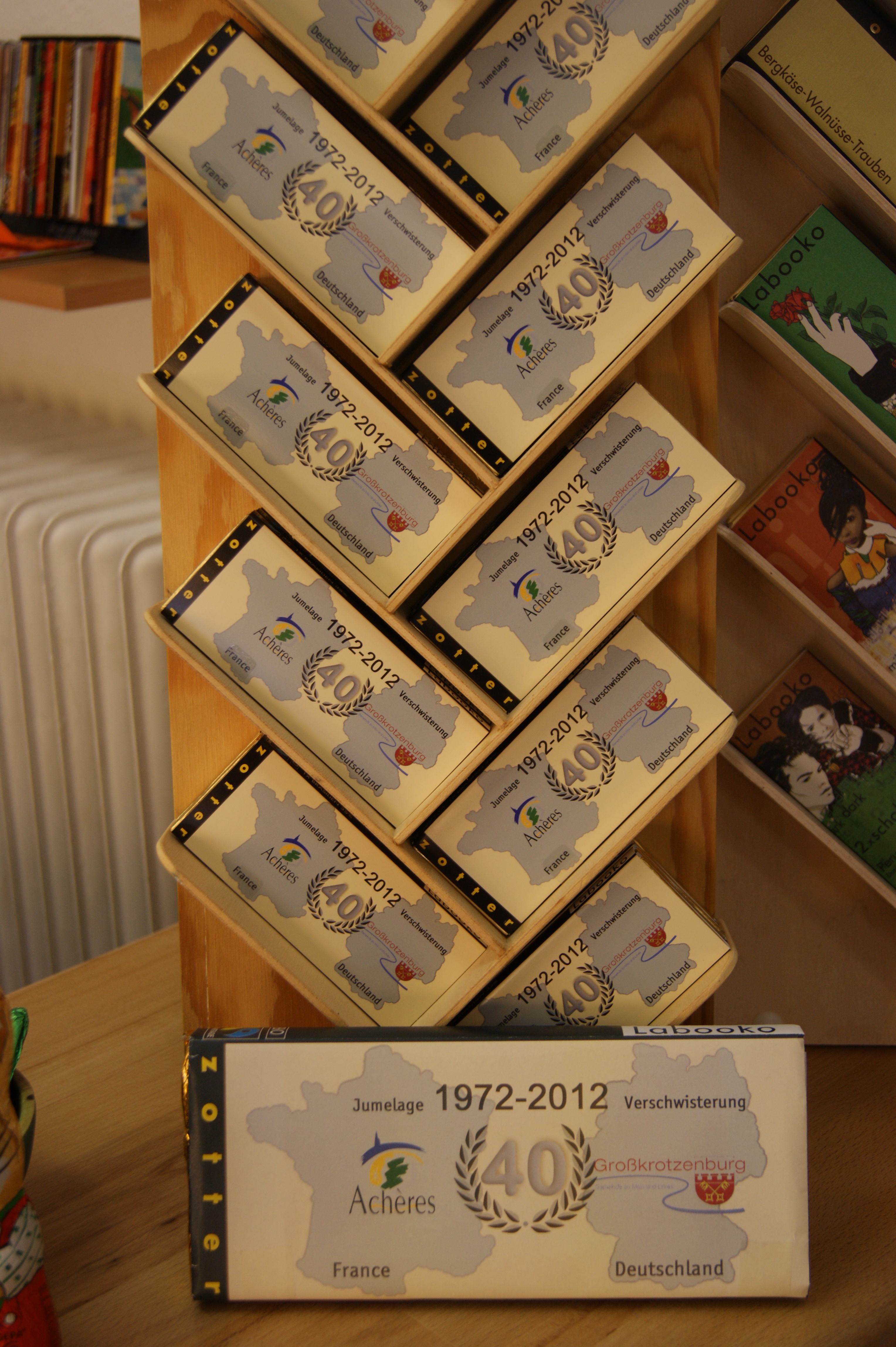 Am Montag, den 26.03.2012 übergab der Weltladen Großkrotzenburg die neue Schokolade aus fairem Handel mit dem Logo zur 40jährigen Verschwisterung zwischen Großkrotzenburg und Achères/ Frankreich zum offiziellen